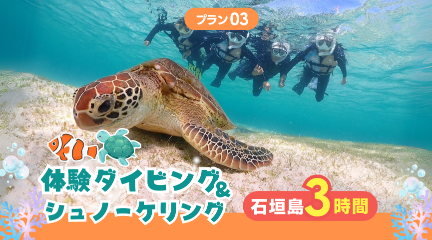 石垣島のウミガメは浅瀬にいることが多く、体験ダイビングシュノーケリングでも会える水深にいます。
